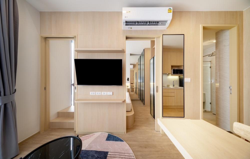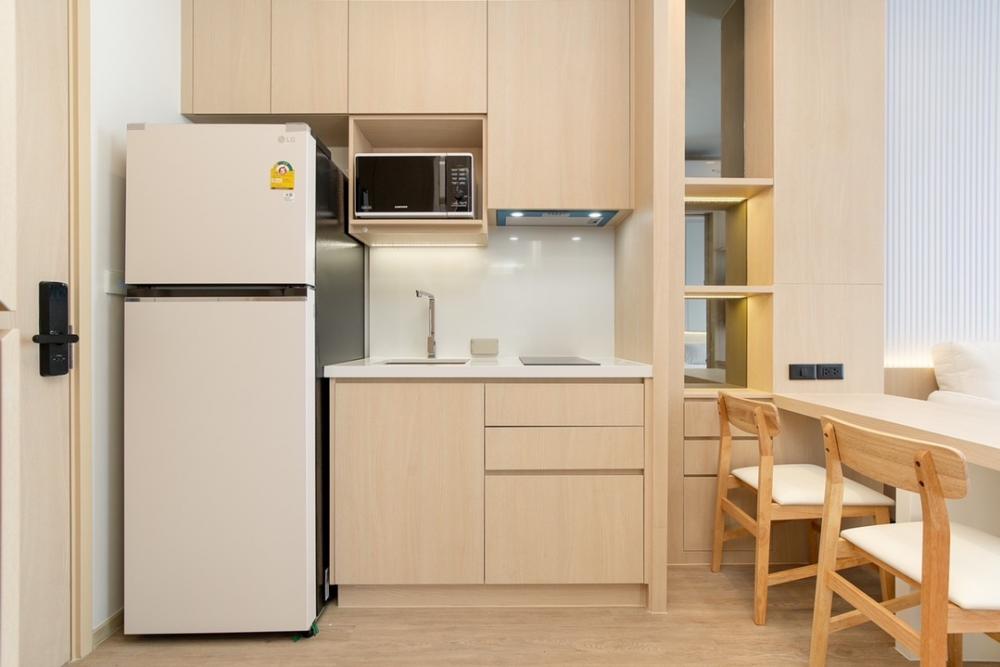 พร้อมแอร์ ทีวี ตู้เย็น ไมโครเวฟ เตาไฟฟ้า เครื่องดูดควัน เครื่องซักผ้า และเครื่องทำน้ำอุ่น