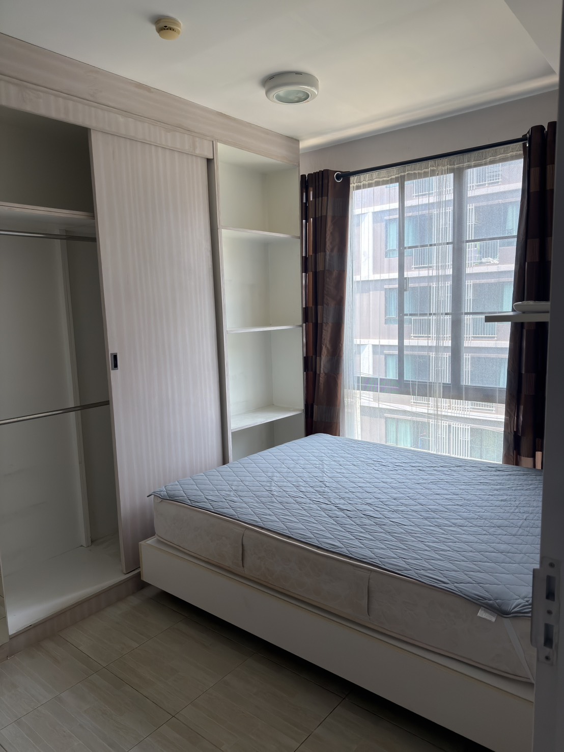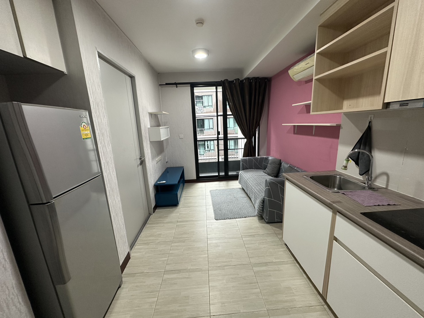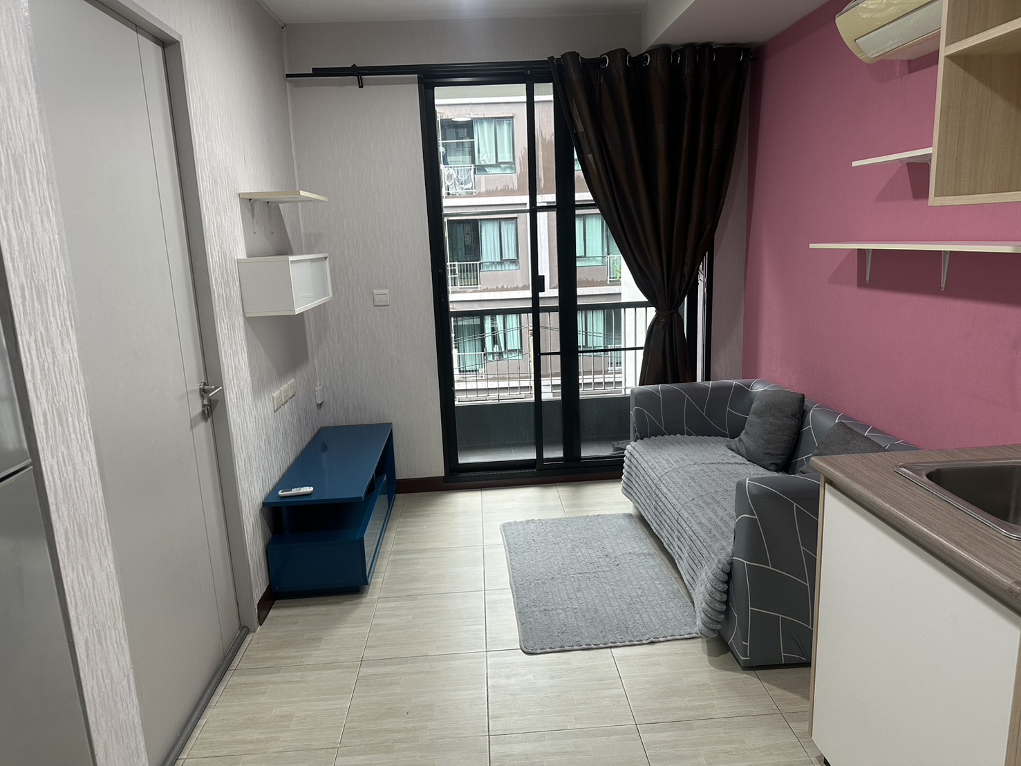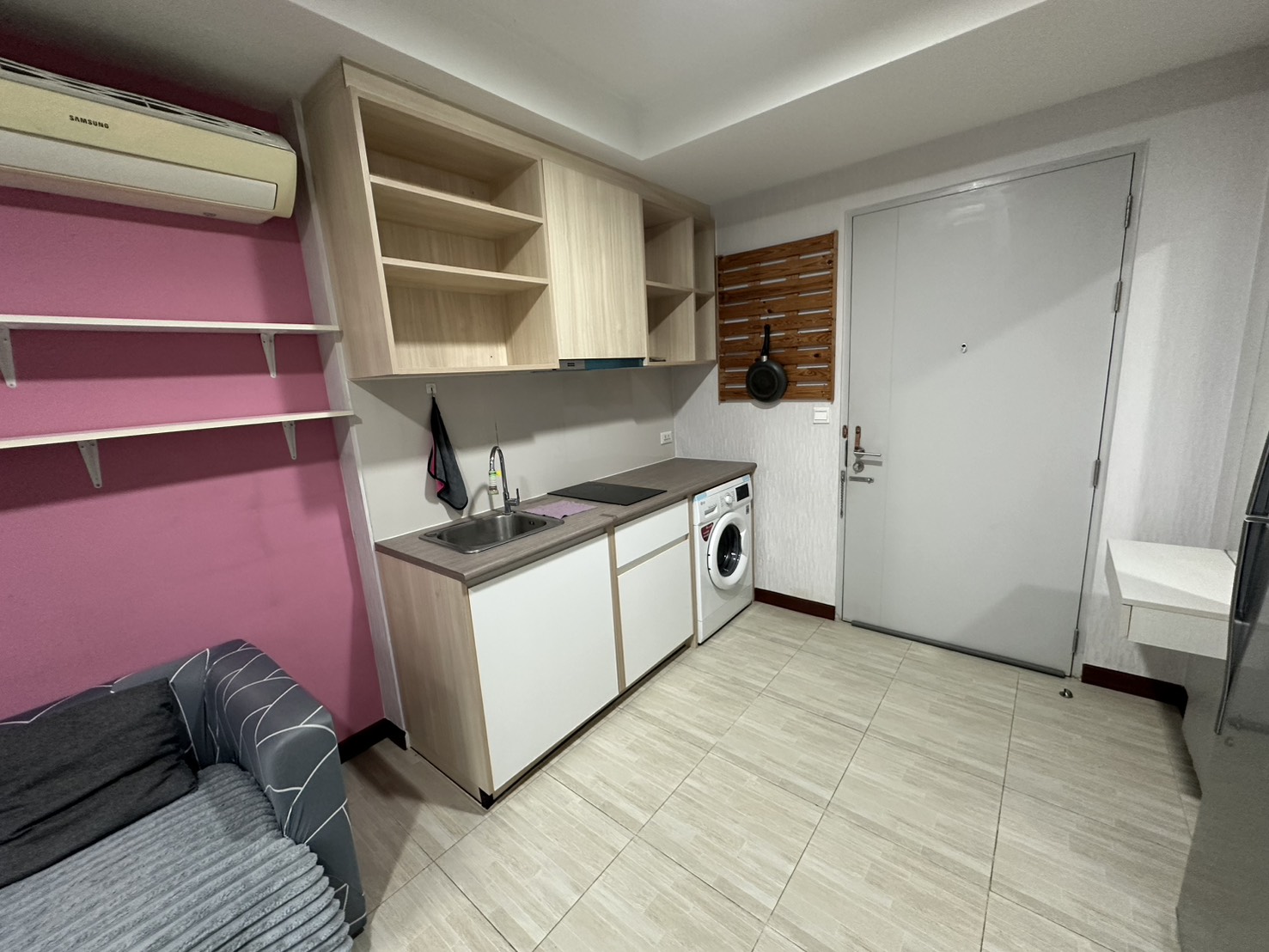 มีเฟอร์นิเจอร์ เช่น โซฟา ตู้เสื้อผ้าบิ้วอิน และชั้นวางของ