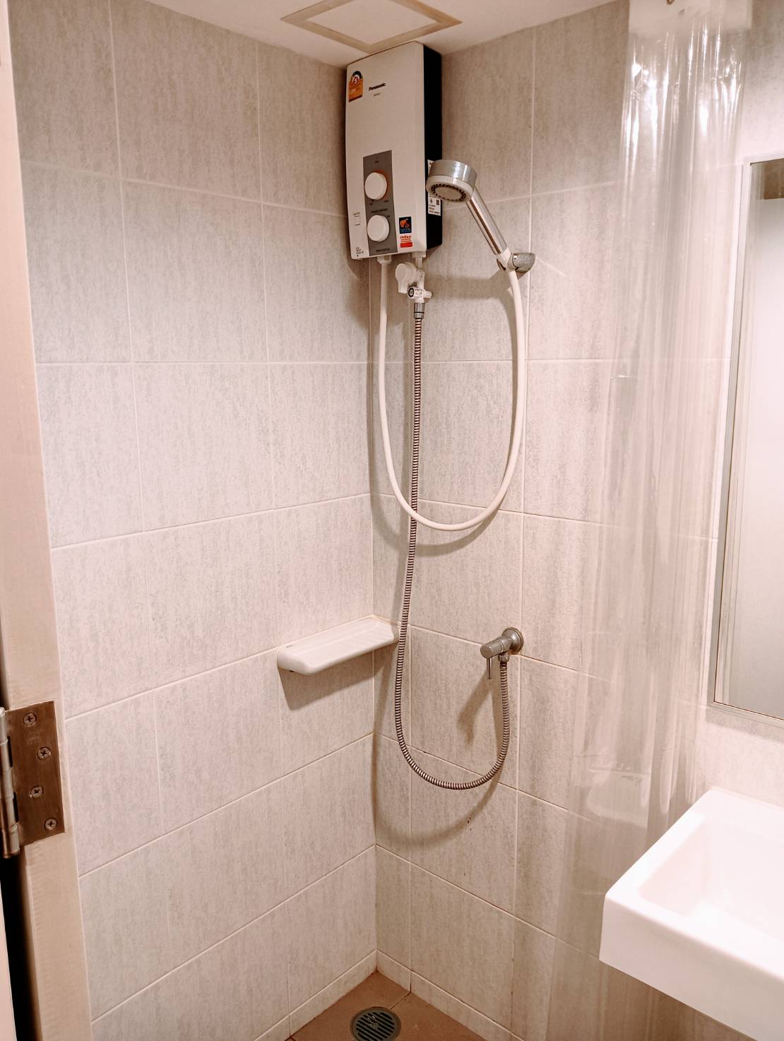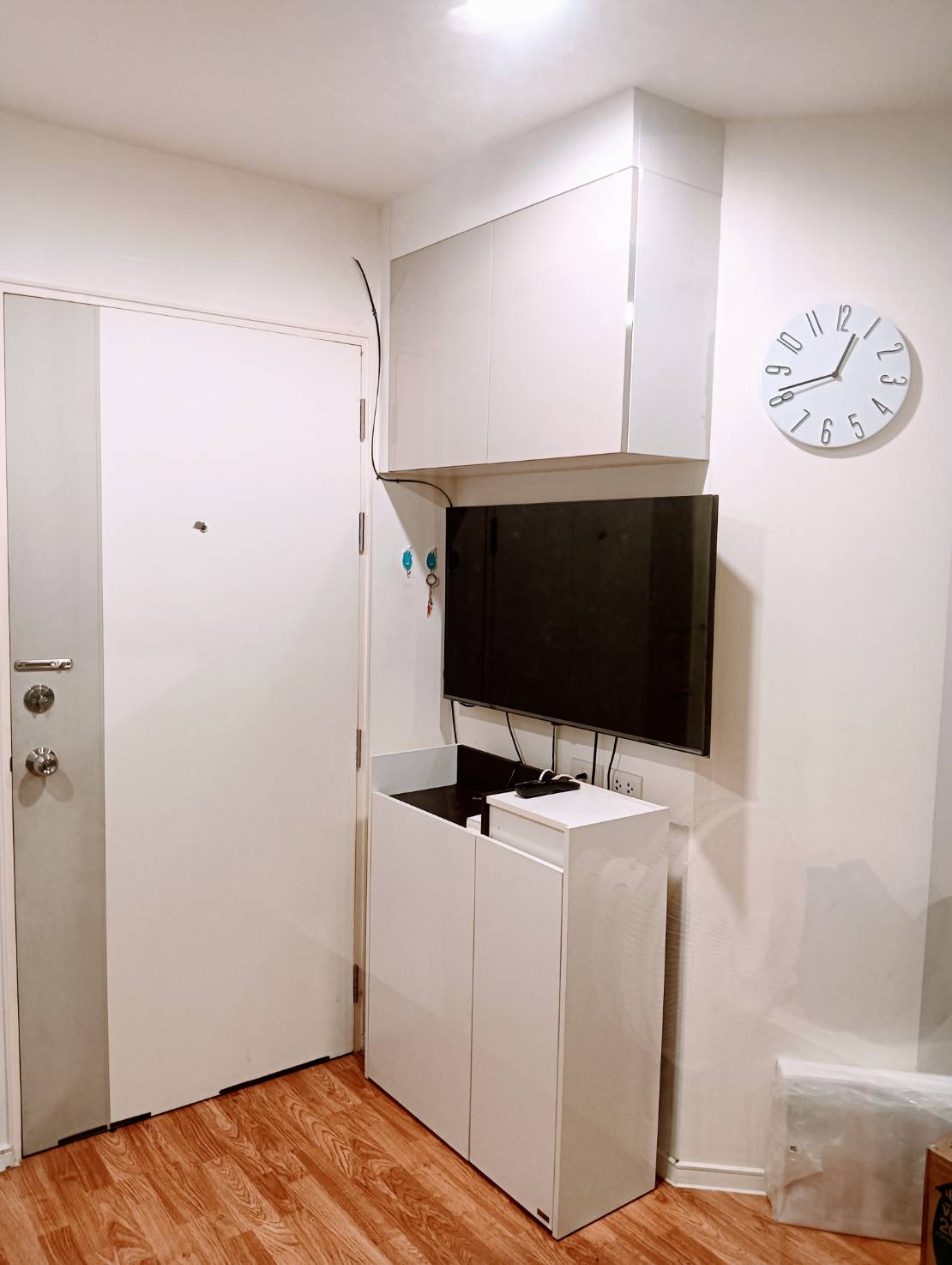 Wall-mounted Smart TV, 2-door refrigerator, microwave, air conditioner, and Panasonic water heater.
