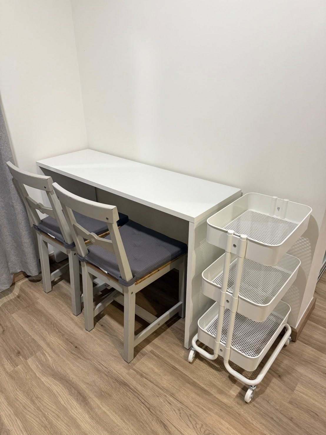 6-foot bed (new) | Mattress protector (new) | Built-in wardrobe (new) | Dressing table (new) | Dining table (new) | 2 chairs | Sofa | Work desk | Shelves (new) | Dish drainer (new)