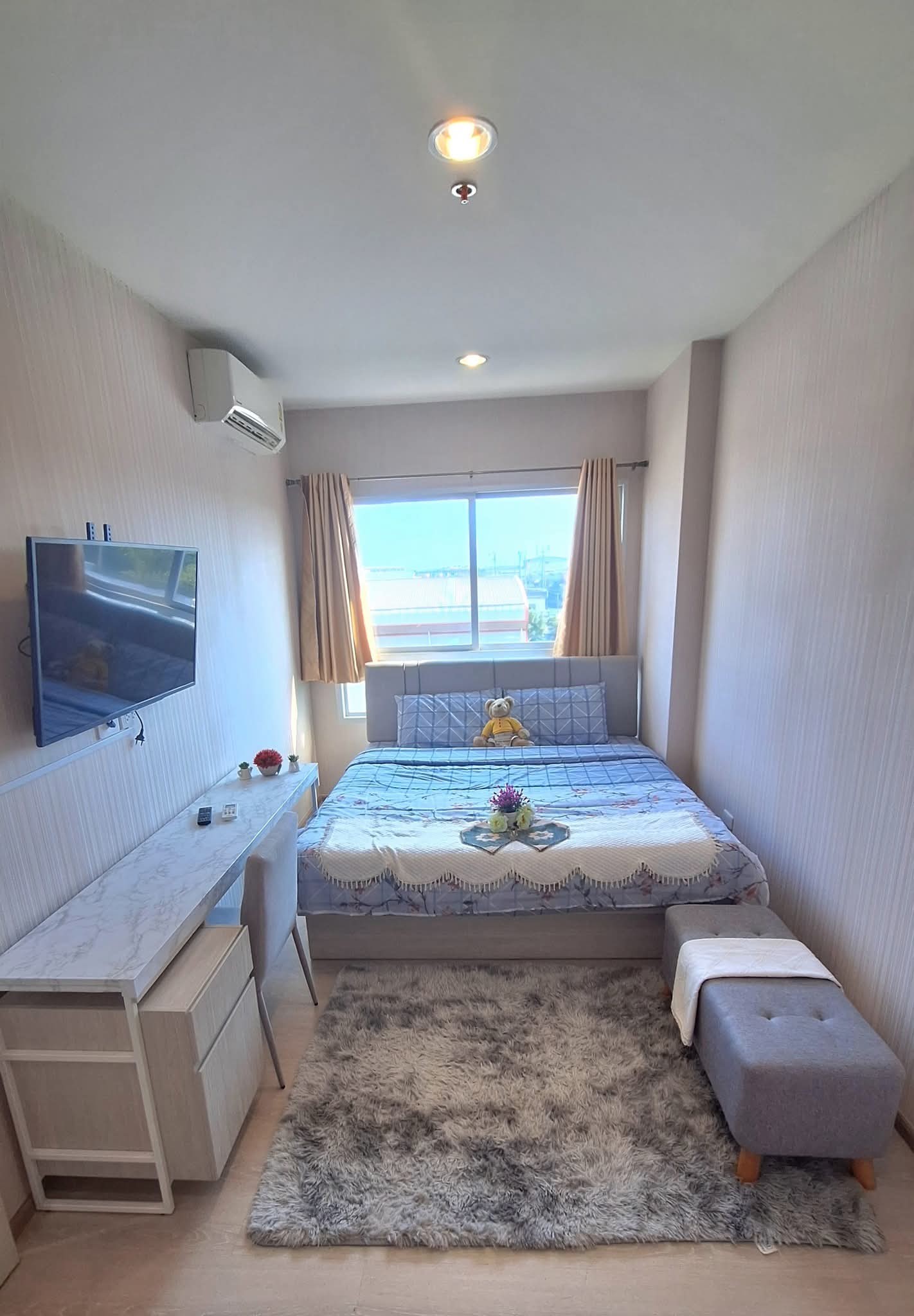 อื่นๆ: เตียง 6 ฟุตพร้อมที่นอน/ชุดผ้าปูใหม่, โต๊ะทานอาหาร 2 ที่นั่ง, ฉากกั้นอาบน้ำกระจก, โซฟาห้องรับแขก, โซฟาห้องนอน, โต๊ะอเนกประสงค์ (ในห้องนอนและห้องครัวพร้อมอุปกรณ์), โต๊ะวางทีวี