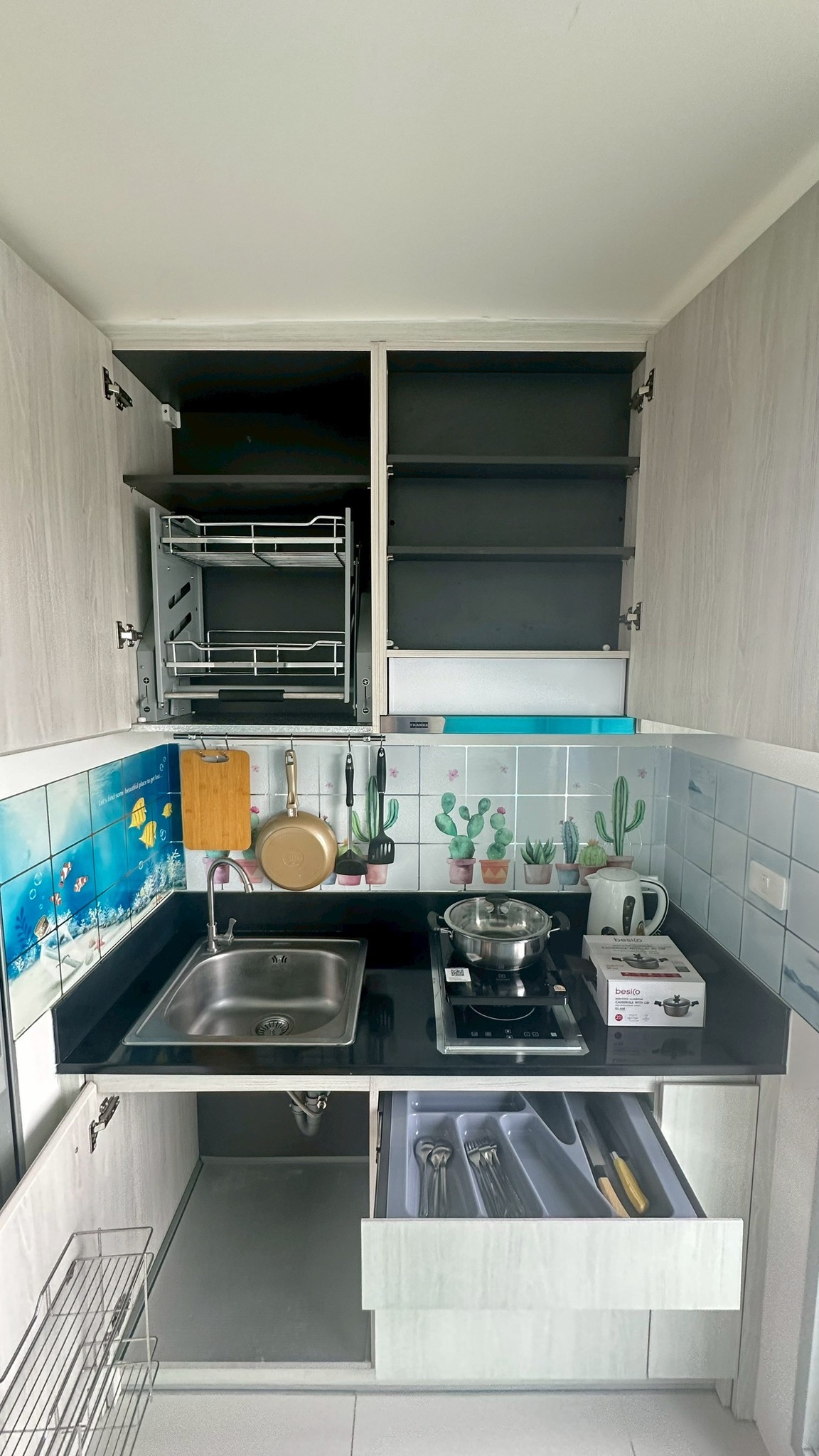Appliances: 2 Air conditioners, Water heater, Refrigerator, 2 TVs, Electric kettle, Microwave, 13 kg Washing machine, Electric stove with pot and pan.