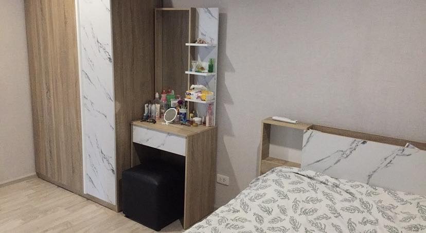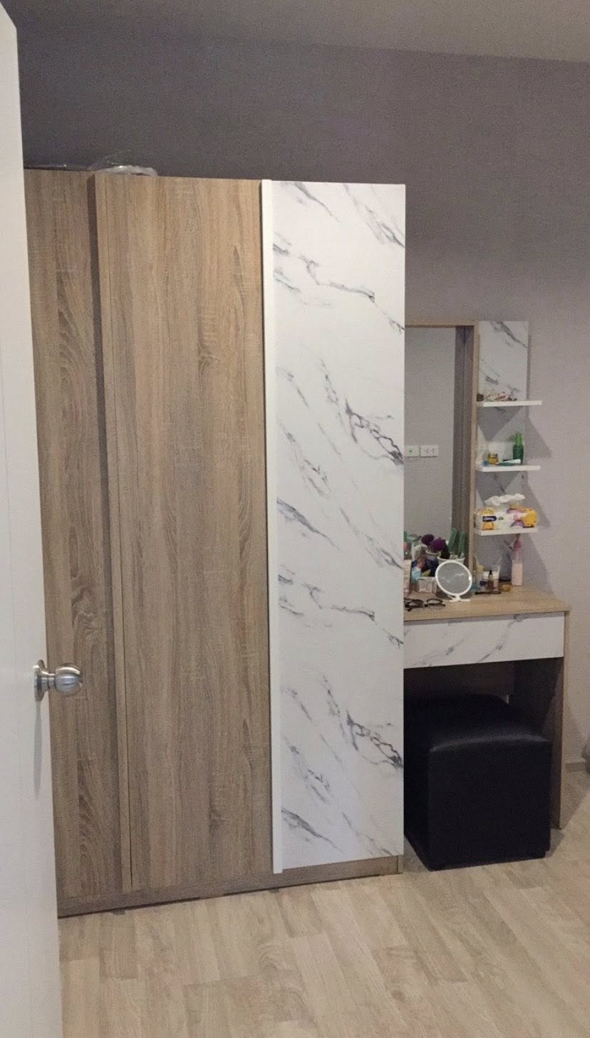 เตียง 5 ฟุต ตู้เสื้อผ้า โซฟา โต๊ะกินข้าว และโต๊ะเครื่องแป้ง