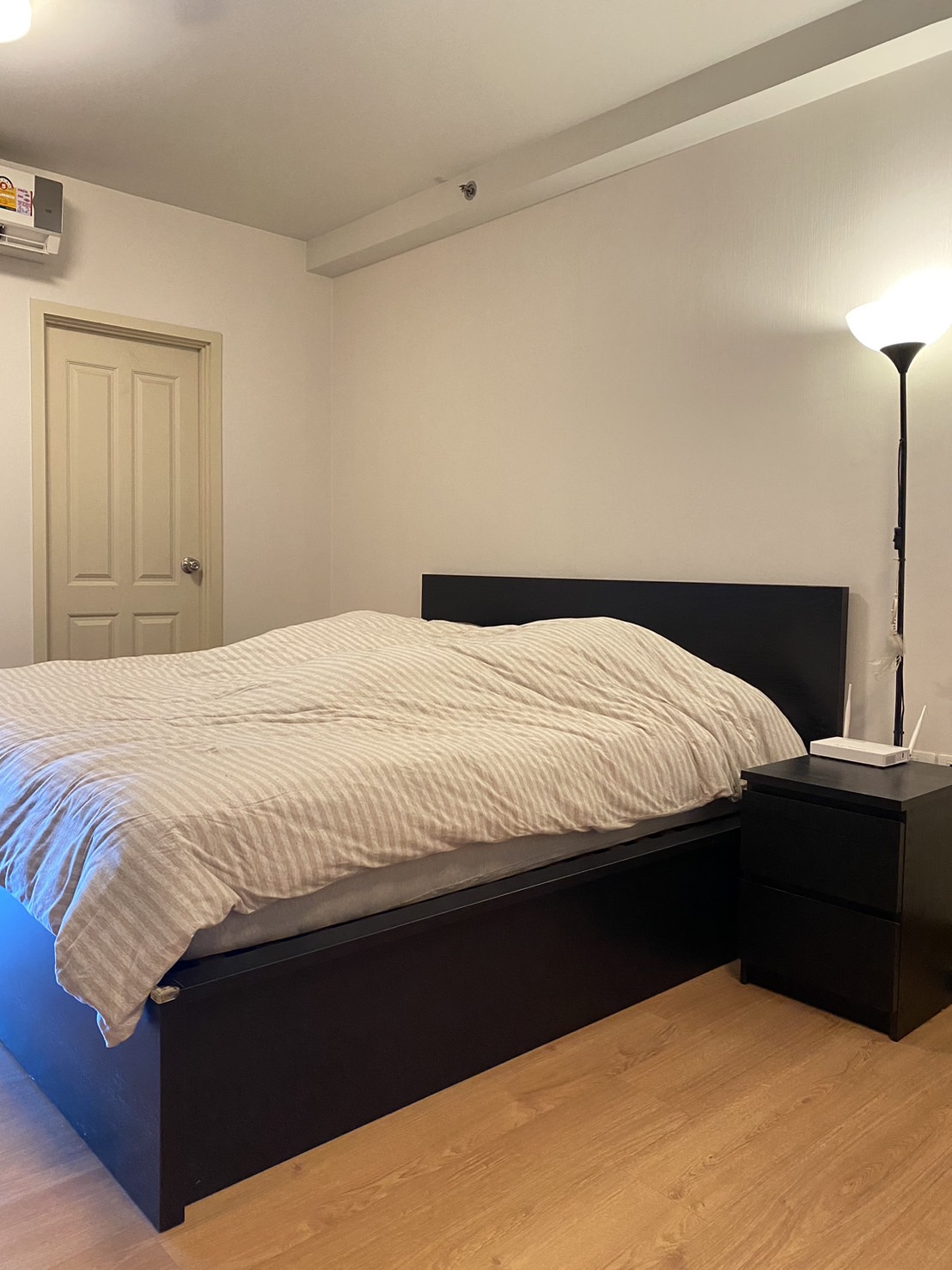 Furniture: 6-foot bed (Slumberland with storage), sofa bed, 2 wardrobes, dressing table, digital fingerprint/code door lock, parking sticker.