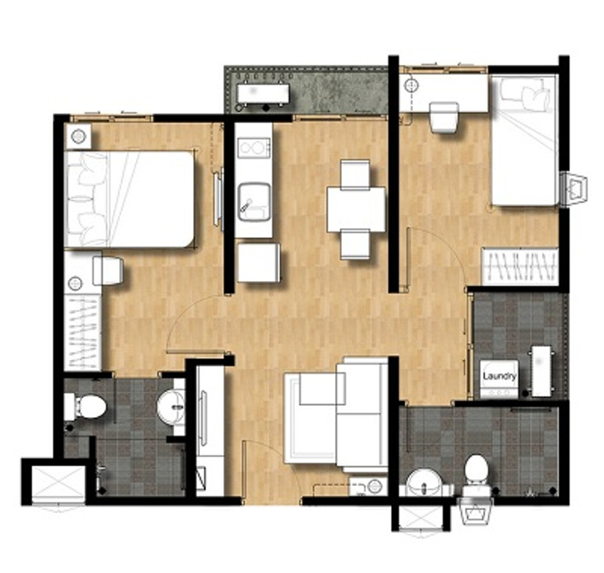 🛏️ 2 ห้องนอน | 🚿 2 ห้องน้ำ | 🛋️ 1 ห้องนั่งเล่น + ห้องครัว