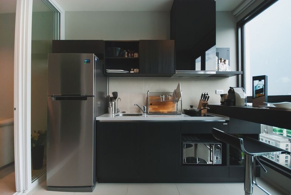 ภายในห้องมีเฟอร์นิเจอร์และเครื่องใช้ไฟฟ้า พร้อมอุปกรณ์ครัว