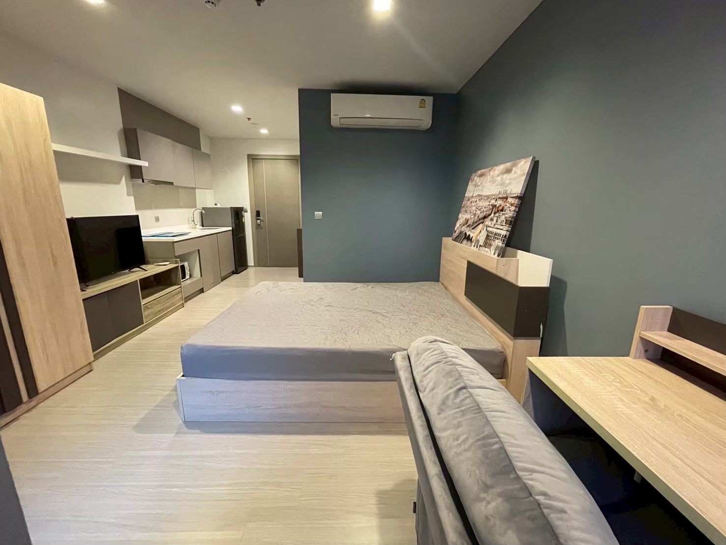 Bed, wardrobe, desk, built-in kitchen cabinets, and digital door lock.