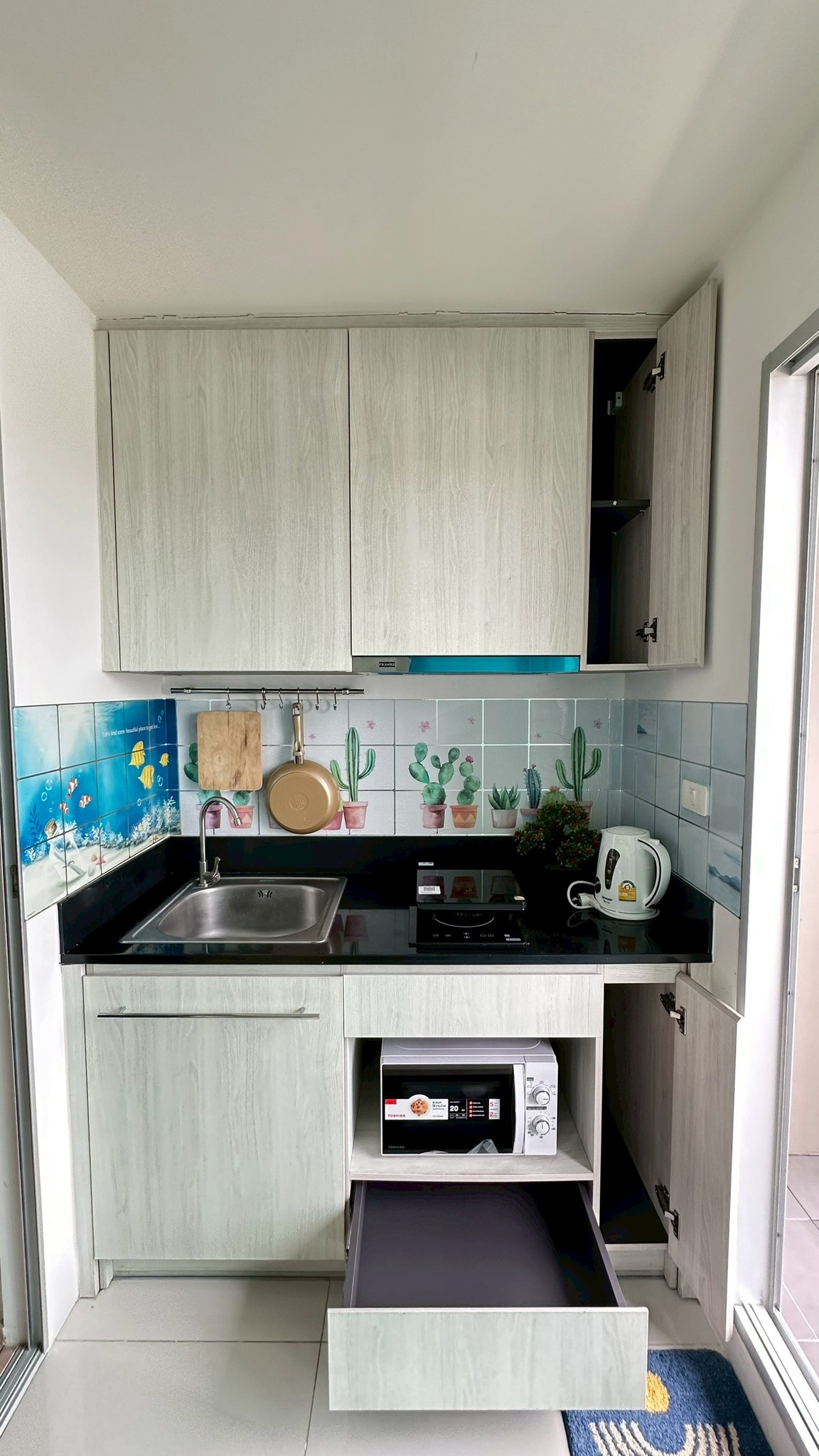 Appliances: 2 Air conditioners, Water heater, Refrigerator, 2 TVs, Electric kettle, Microwave, 13 kg Washing machine, Electric stove with pot and pan.